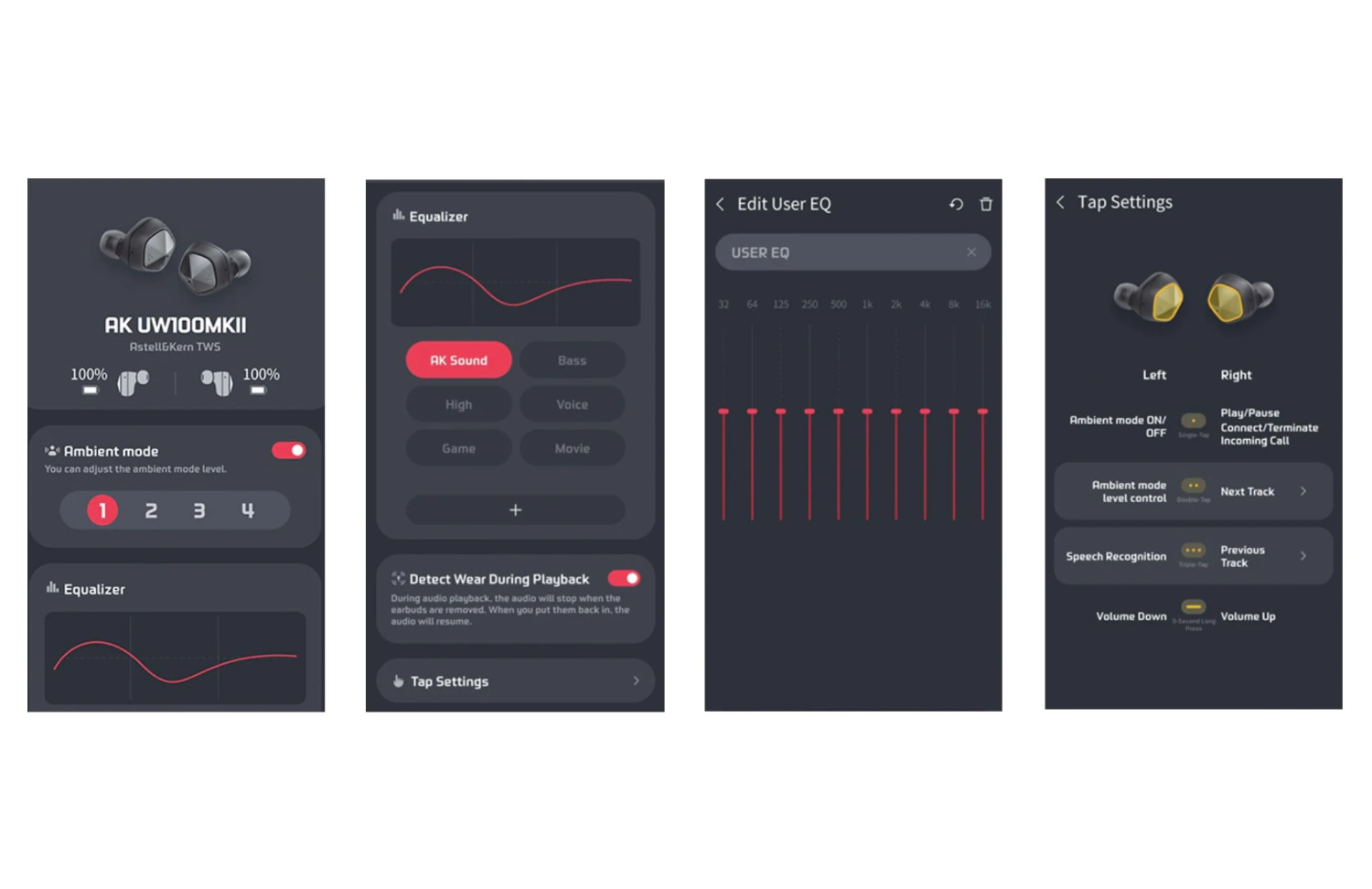 Instale la aplicación exclusiva para utilizar varias funciones y disfrute de una configuración sencilla. La aplicación AK TWS está equipada con varias funciones de usuario recientemente desarrolladas para el AK UW100MKII. Los usuarios ahora pueden controlar cómodamente la información básica de la batería, la configuración del ecualizador del usuario, la disposición de las teclas táctiles, el control del escenario ambiental, etc.