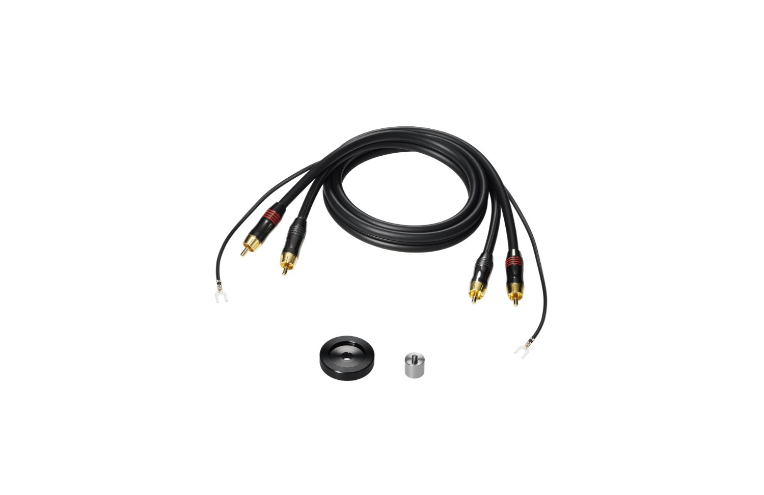 El giradiscos incluye un cable de salida RCA desconectable (RCA doble macho a RCA doble macho con toma de tierra), un adaptador de 45 rpm y una cubierta antipolvo abatible y desmontable.