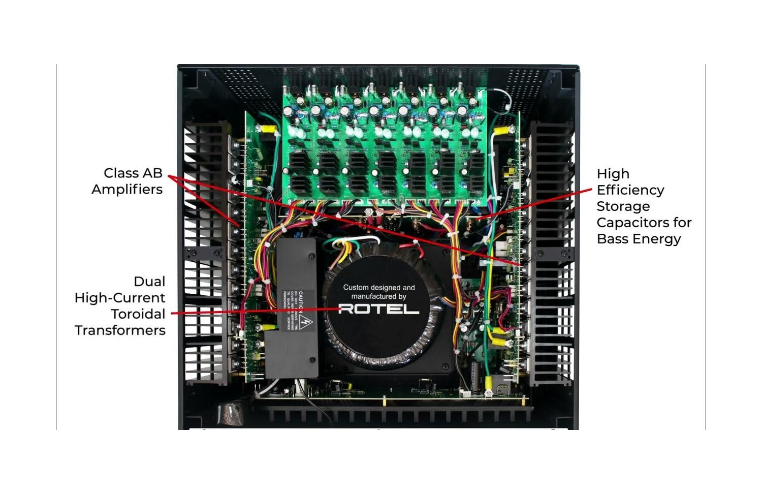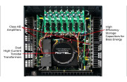 La circuitería de amplificación en Clase AB de la RMB-1587MKII está construida en torno a dos enormes transformadores toroidales de alta corriente de fabricación propia diseñados para suministrar corriente ultraestable a un conjunto de 8 condensadores de almacenamiento de energía de alta eficiencia. El uso de esta arquitectura en la fuente de alimentación proporciona unos graves ricos y profundos con lo último en autoridad y control incluso cuando se utilizan cajas acústicas particularmente más exigentes.