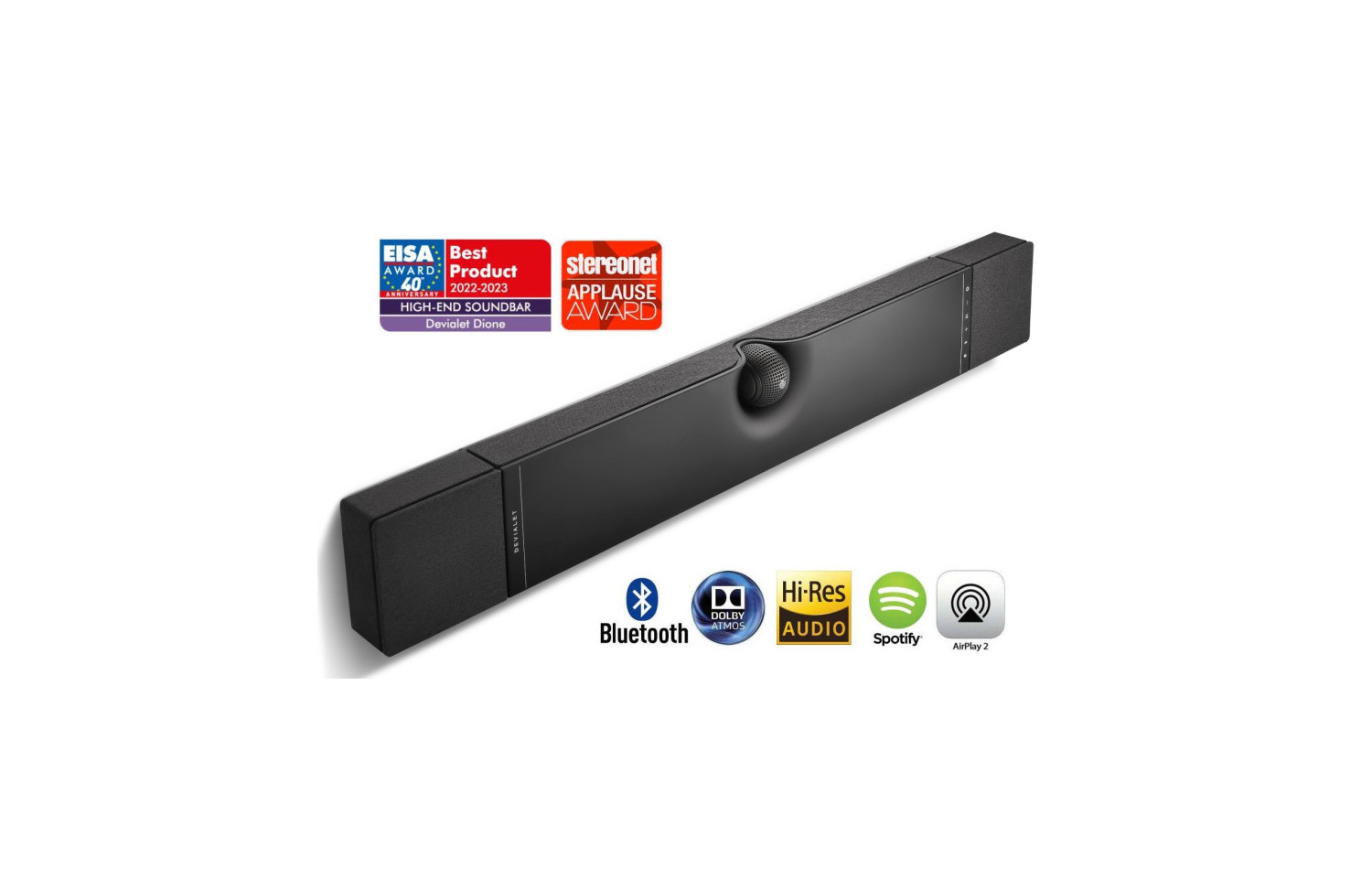 Devialet Dione es la ingeniería acústica de Devialet aplicada al cine en casa: una barra de sonido Dolby Atmos 5.1.2 todo en uno de gama alta que eleva todos los contenidos de tu televisor.