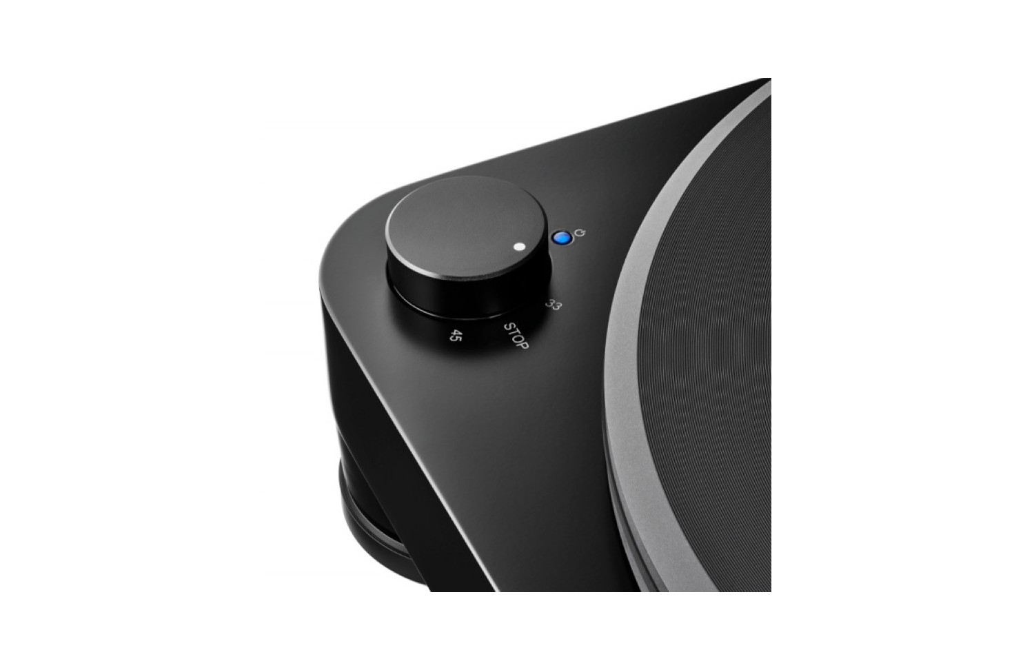 El eje de acero inoxidable cuenta con un cojinete de plástico térmico tipo lámina en su base, lo que garantiza una rotación de baja fricción que se mantiene con precisión a 33-1/3 o 45 RPM gracias al sistema de sensor de velocidad del giradiscos.