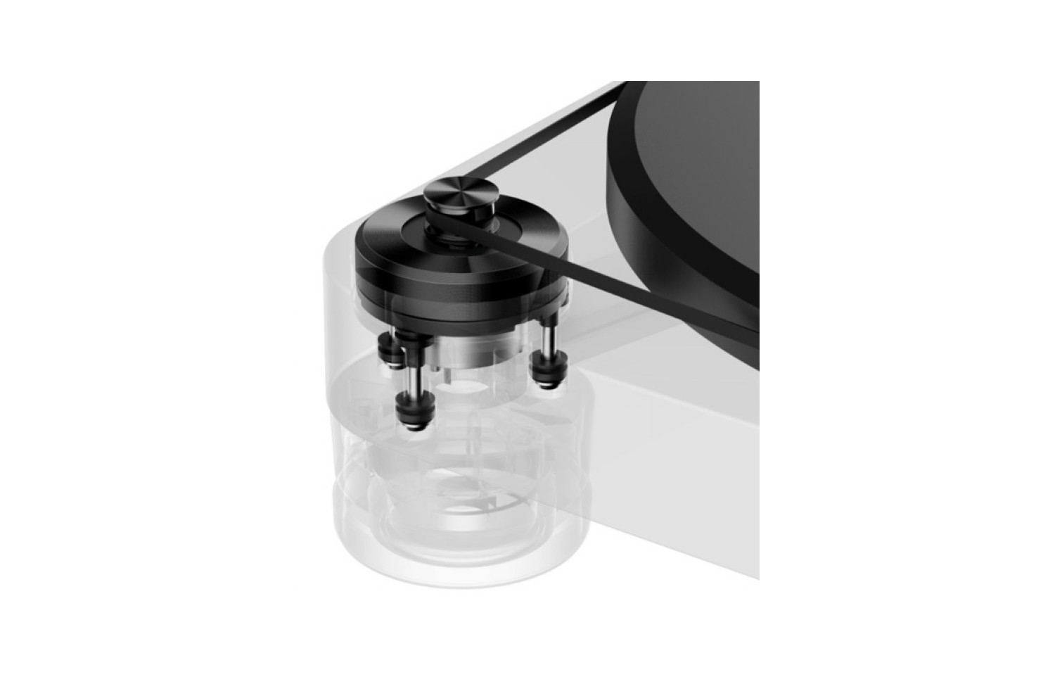 El plato acrílico de 20 mm del giradiscos es accionado por un motor controlado por un sensor óptico que garantiza una velocidad de rotación continua y precisa de 33-1/3 o 45 RPM. El motor está montado sobre casquillos de goma que amortiguan las vibraciones, diseñados para desacoplar el motor de la base, minimizando la transmisión de ruido mecánico y oscilaciones. Una fuente de alimentación conmutada externa aísla la conversión de CA a CC para evitar que añada interferencias eléctricas, y las patas de aislamiento con muelle y altura ajustable del giradiscos ofrecen una excelente protección contra el ruido externo.