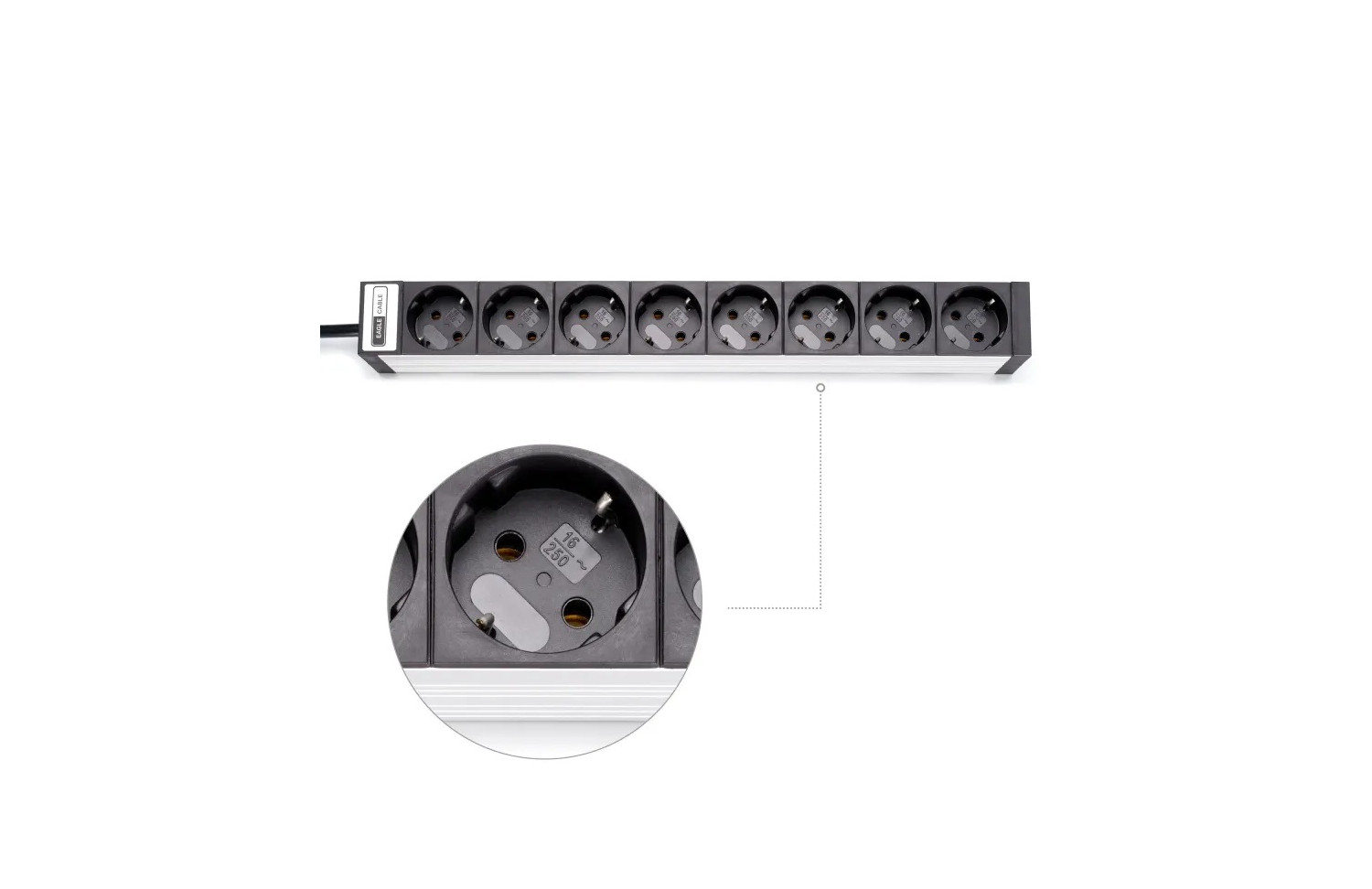 The Deluxe Alu-8 power strip offers a robust, low-loss solution for stable power distribution in high-end installations. Its aluminium housing not only provides mechanical durability, but also acts as an effective shield against electromagnetic interference. The eight black Schuko sockets are rotated 45°, allowing for clean and accessible cable management. Even large plug-in power supplies or angled connectors fit easily thanks to their generous 44.45 mm spacing, without obstructing each other.
