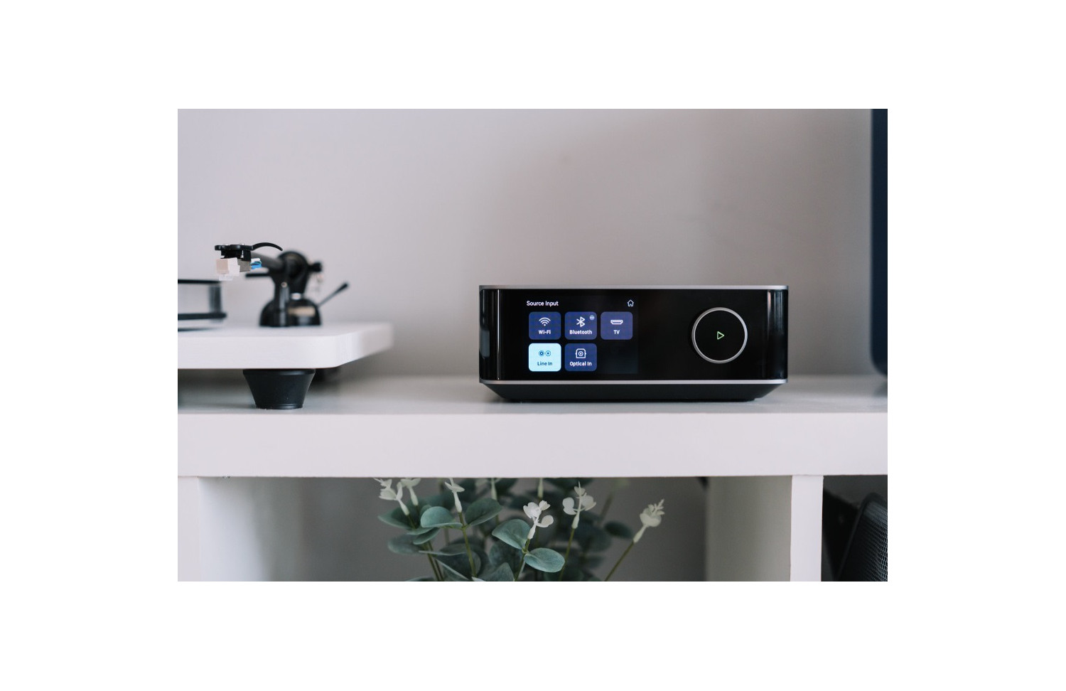 A convenient 3.5? glass touchscreen displays album art, VU meters and one-touch controls in the centre: switching inputs, adjusting settings and navigating playback is simple, with instant visual feedback.
