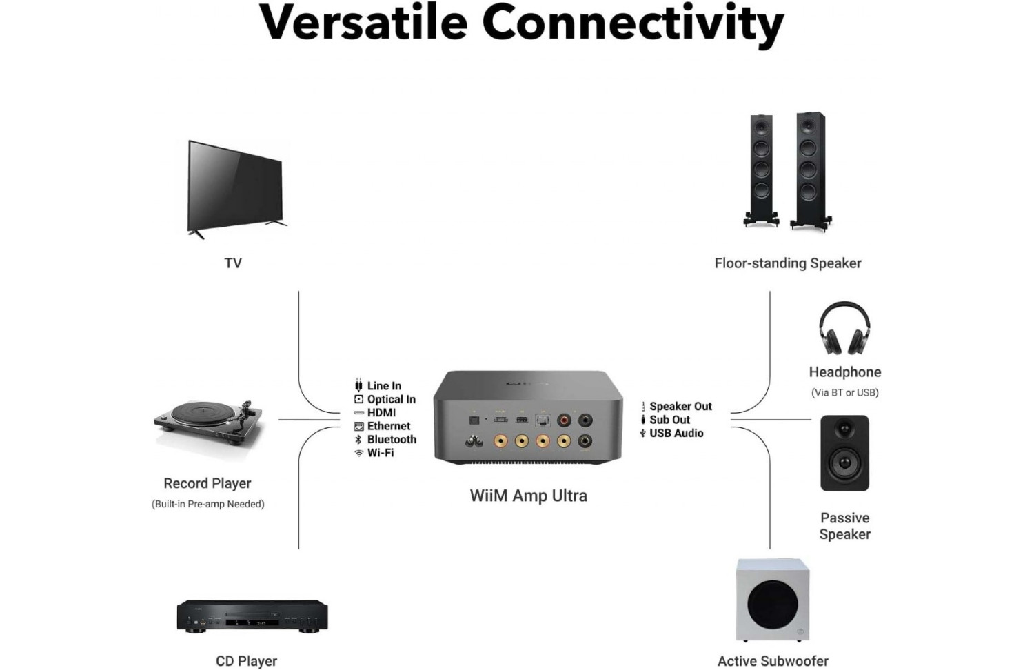 The Wiim Amp Ultra offers next generation wireless streaming, stay connected with the latest in wireless technology such as Wi-Fi 6E Tri-Band or Bluetooth 5.3 with SBC and AAC support. Stream ultra high-resolution audio with near-zero latency: no interruptions, no delays, just music.