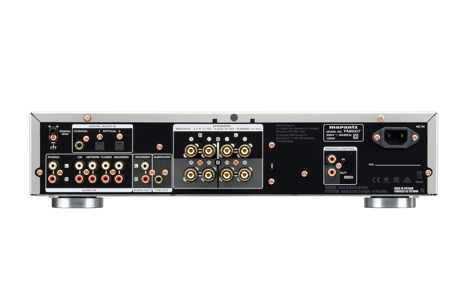 In terms of connectivity, the PM6007 includes 5 analogue inputs (including a phono input for moving magnet cartridges) and 3 digital inputs (one coaxial and two optical), plus a subwoofer output. Digital audio enthusiasts can enjoy high-resolution content thanks to an internal AKM AK4490 reference DAC with 24-bit/192 kHz technology. The PM6007 is rounded off by a classy construction featuring two sets of high-quality speaker connection terminals (A/B), a shielded DAC section, high-purity copper screws and sturdy feet.