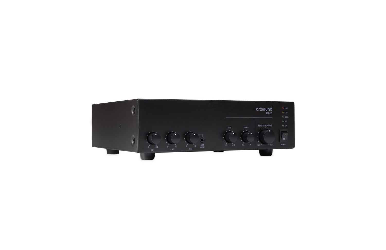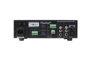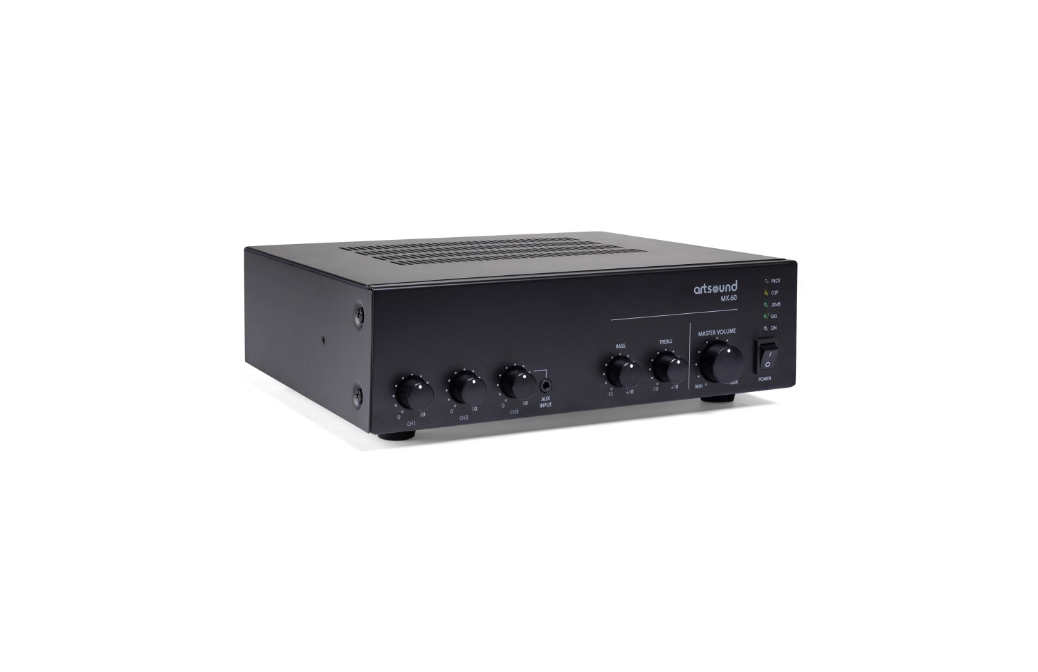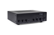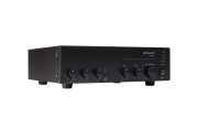 The Artsound MX-60 is a compact mixer amplifier ideal for commercial and industrial applications. It offers individual volume control for each channel and features short-circuit and thermal overload protection. Designed to work with high-fidelity passive loudspeakers and 70V and 100V PA systems, it can deliver up to 60W and has three microphone inputs (1 XLR and 2 1/4" jacks), two line inputs and a priority "Phoenix" input. The latter allows the music on other inputs to be interrupted to give priority to the signal.