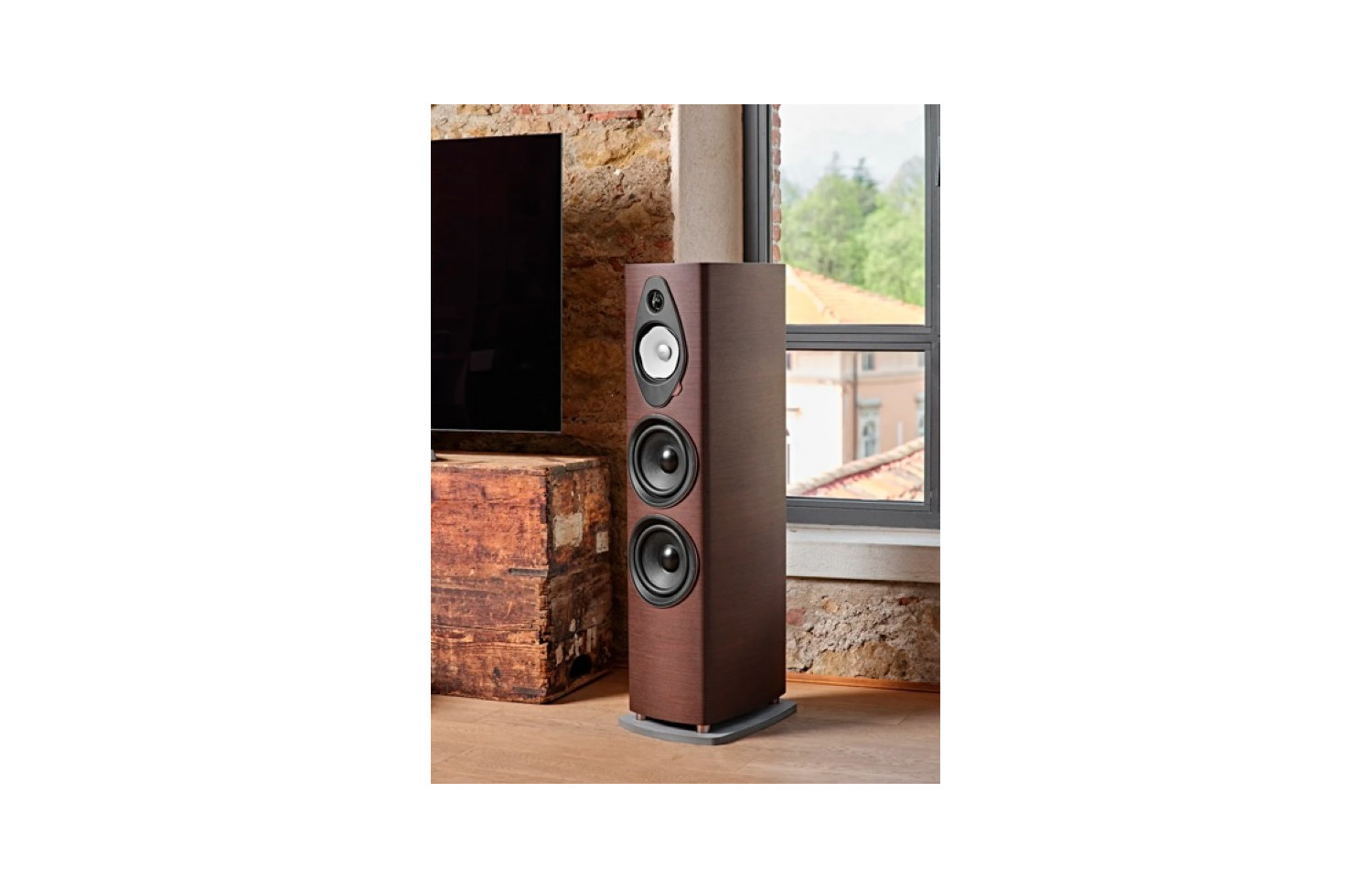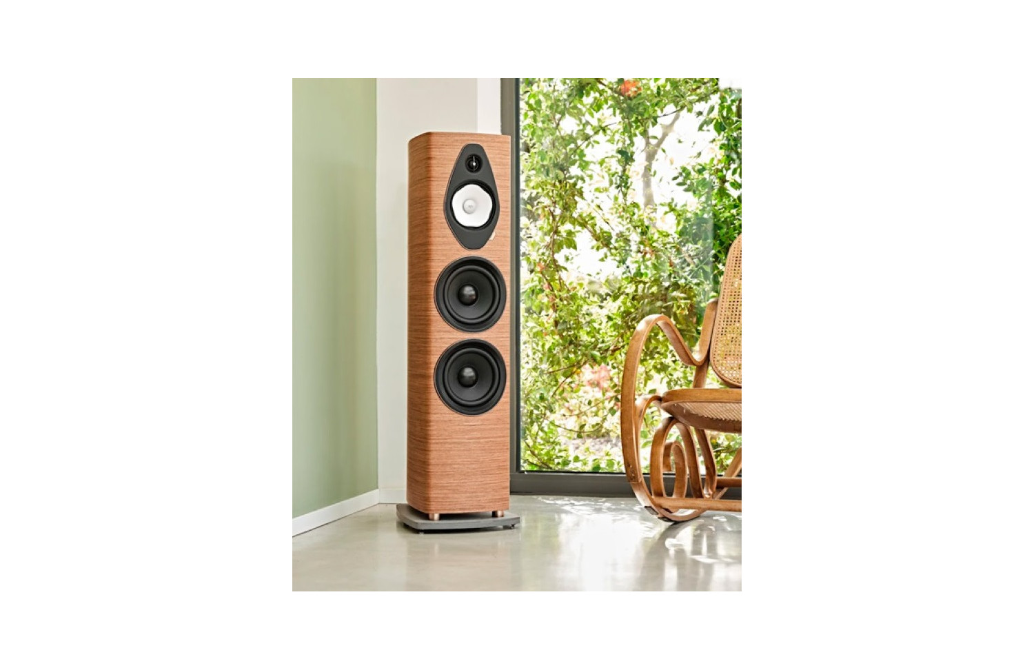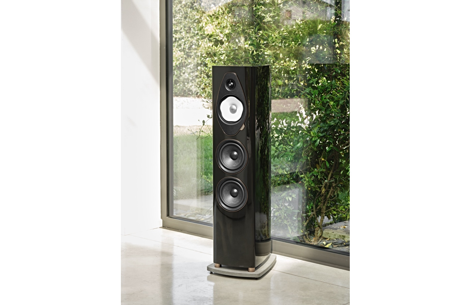 This refined loudspeaker package is managed by a sophisticated crossover filter based on Sonus Faber's unique hybrid IFF and Paracross Topology circuitry, while on the acoustic side it features a classic lute profile constructed from high quality wood panels from Sonus Faber, an elegant concrete base and a new round cover that protects the connection terminals (designed specifically for bi-wiring).