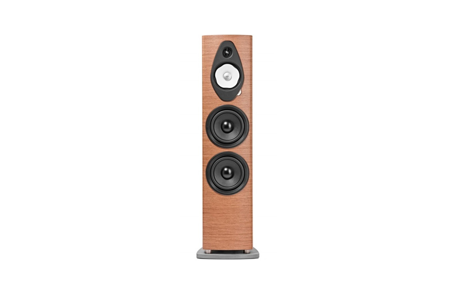 It uses a 3-way/4-speaker bass-reflex configuration, featuring a 28 mm diameter silk dome tweeter with the effective DAD (Damped Apex Dome) technology, a 165 mm Camelia midrange speaker and two 203 mm woofers with a paper pulp sandwich cone structure. Of the latter three drivers, their peripheral suspension exhibits a unique floral pattern that not only adds visual elegance, but also helps to reduce interference and increase the linearity range.
